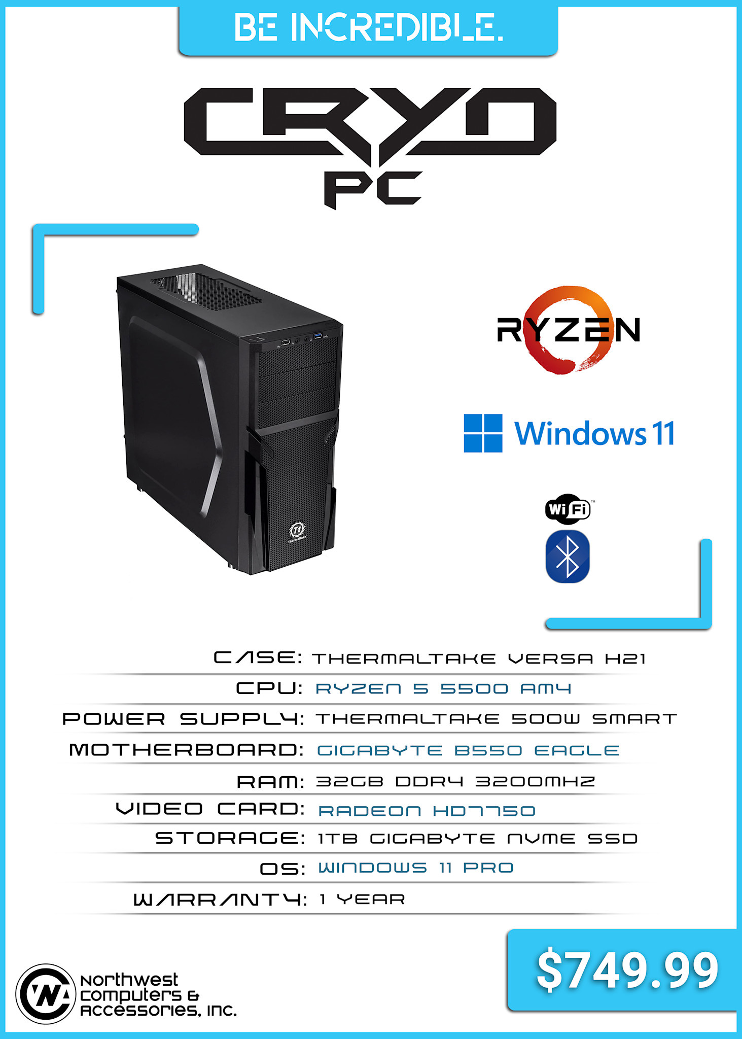Cryo-PC Mid Tower, Office/Trading Computer, AMD Ryzen 5500 - Radeon HD7750 - 32GB DDR4 - 1TB NVMe